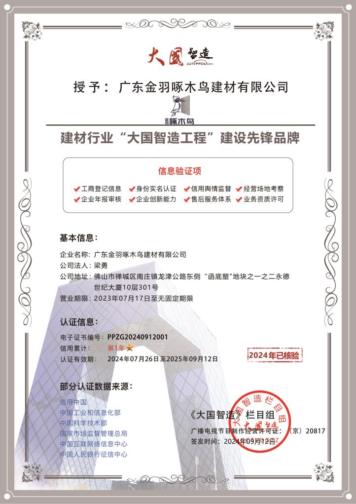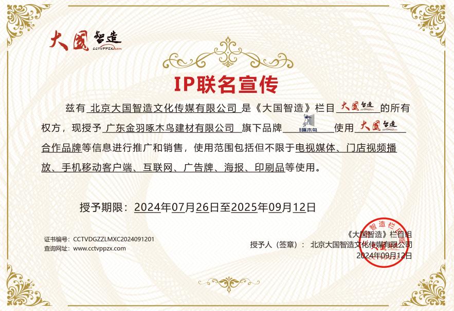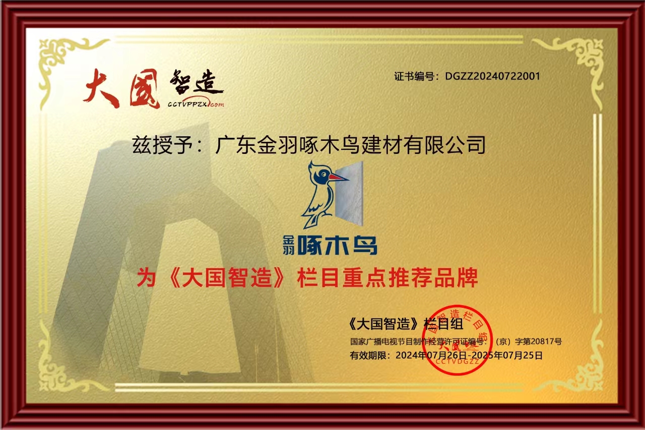 近日,广东金羽啄木鸟建材有限公司旗下“金羽啄木鸟”品牌与《大国智造》栏目战略合作签约仪式成功举办,本次合作,双方正式成为战略合作伙伴,《大国智造》栏目将集结多方资源共同宣传推广“金羽啄木鸟”品牌,帮助品牌提高知名度和影响力,为品牌强势赋能。