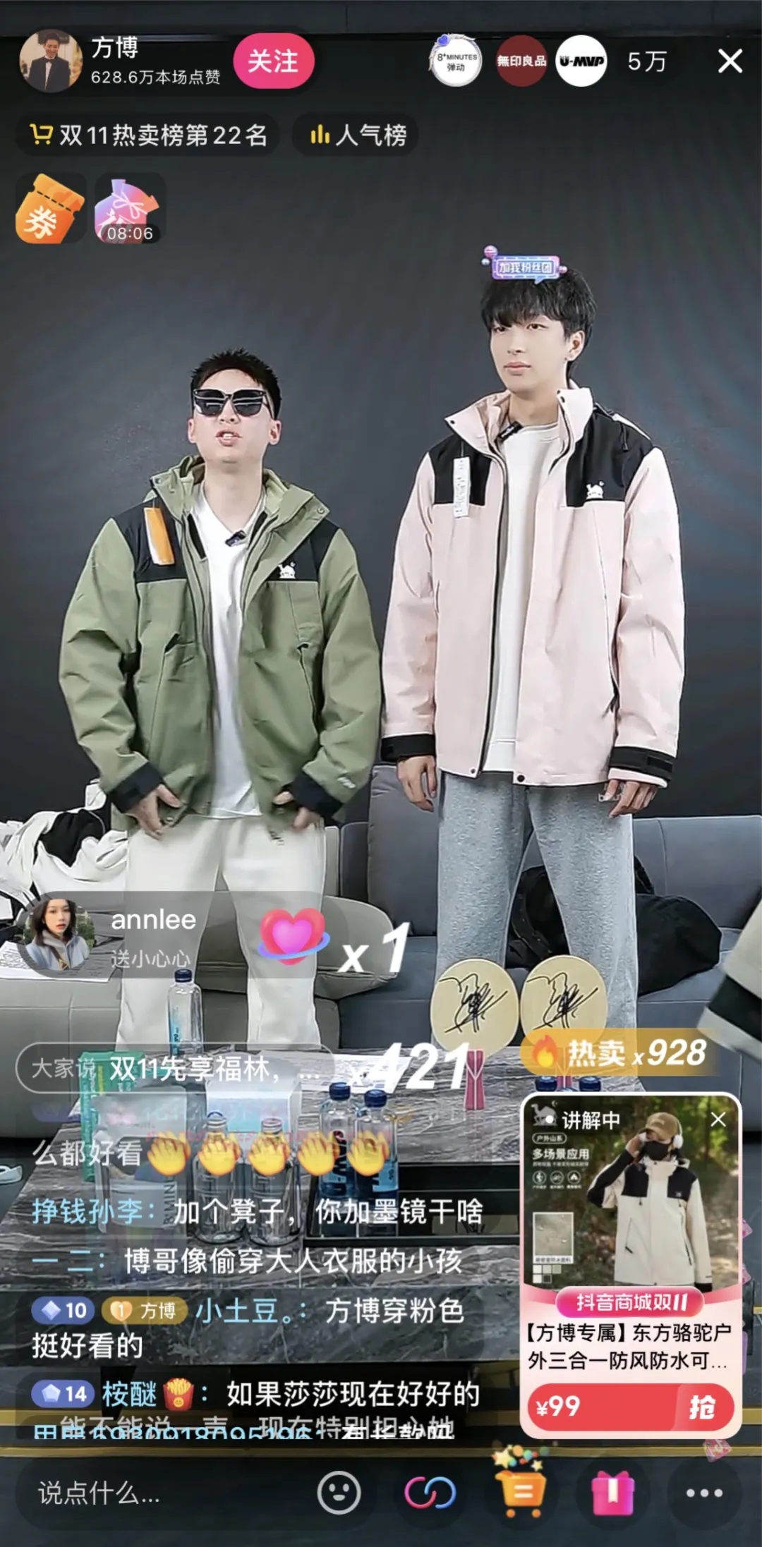 10 月 20 日的直播中,方博还邀请到了肖凯文(国乒教练肖战之子)作为首期嘉宾来合体拍摄短视频及直播。两人一方面作为体育方面的专业人士销售运动饮料和男装等等,充分得到了消费者的信任。另一方面,两人的身高差也构成了具有反差感的戏剧效果,由于身高差形成的衣服上身差异还有了一个专属词条“买家秀 vs 卖家秀”,并因此登上了抖音热榜 top1。