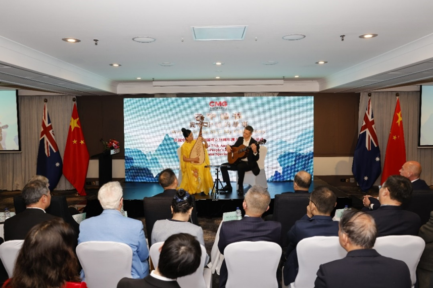 75周年澳大利亚专场活动在堪培拉举办。本次活动由中国中央广播电视总台主办。中宣部副部长、中央广播电视总台台长慎海雄作视频致辞。中国驻澳大利亚大使肖千、澳大利亚旅游局东半球市场及国际航司业务执行总经理何安哲、澳中友好协会堪培拉分会主席卡罗尔·基尔、澳大利亚中国工商业委员会塔斯马尼亚州分会首任CEO马克·培根、悉尼大学中国研究中心教授汉斯·杭智科、《堪培拉时报》专栏作家兼澳大利亚“能力新闻网”总编尼古拉斯·斯图尔特、中国建设银行悉尼分行副行长杰拉丁·欧卡罗出席活动并致辞。中国政府友谊奖获得者、澳大利亚格里菲斯大学荣休教授马克林作视频致辞。来自澳大利亚政界、商界、智库、媒体等社会各界知名友好人士,以及当地华人华侨近百名嘉宾参与活动。