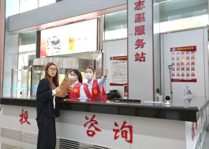 河南省焦作市政务服务中心咨询台工作人员热情接待办事群众。王梦梦 摄