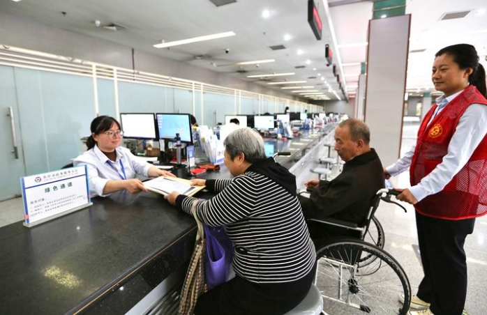 河南省焦作市政务服务中心,工作人员为老年办事群众提供绿色通道服务。王梦梦 摄