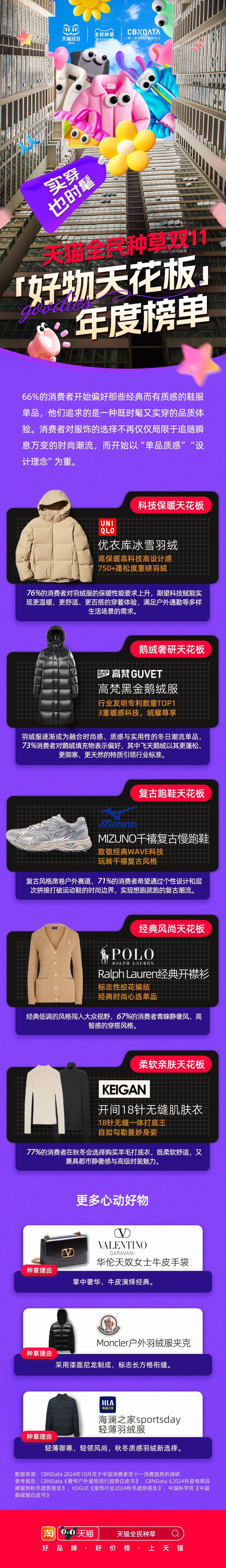 随着消费升级,人们对服饰产品的个性化、差异化和多元化需求日益增长。年轻一代消费者更加注重服饰的品质和设计,对品牌影响力和个性化定制的要求也越来越高。《2024天猫服饰秋冬趋势白皮书》显示,超过50%的消费者相比去年提高了网购服饰的频次,以长尾高增速和高贡献高增速为特征的风口类目分别是毛呢外套、羽绒服、毛针织衫、保暖内衣等。