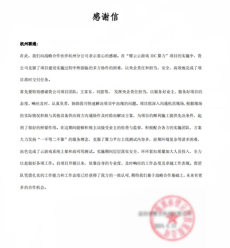 2024年1月,刘恩带领团队成功中标ARM算力项目。该项目的一期部分已完成签约,并于4月初开始上电调试。该项目是杭州联通第一个ARM算力资源服务型业务,主要为云游戏行业提供算力资源弹性按需分配和服务,提供国产算力算法应用服务。刘恩在创新领域的业务接入,为公司其他算力IDC合作项目提供了新的思路,填补了杭州联通该部分业务的空白。