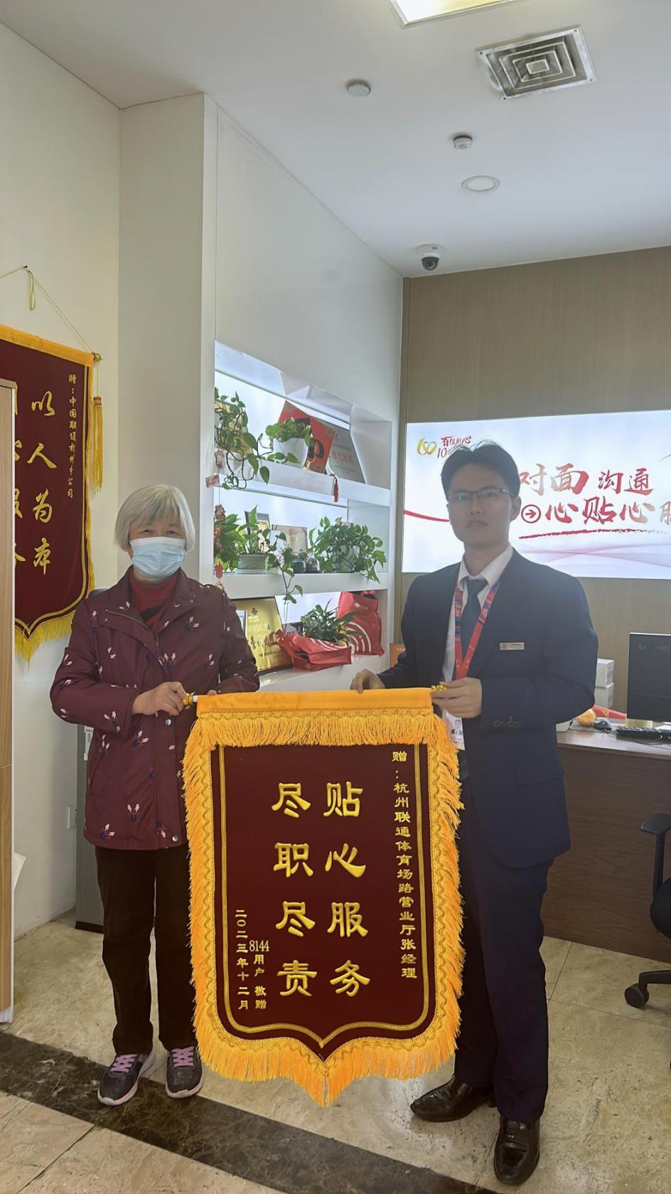 在一连串问题得到妥善解决后,周奶奶对张少峰的感激之情溢于言表。她知道,每当有难题,张少峰都会用他的专业能力和真心帮她一一解决。“你给我省去了很多麻烦,帮了大忙,服务还是联通好!”周奶奶感慨道。为了表达对张少峰感谢,周奶奶还专门制作了一面锦旗,旗上用金色的丝线绣着“贴心服务、尽职尽责”几个大字,这不仅是对张少峰个人的赞誉,更是对整个体育场路营业厅服务品质的肯定。