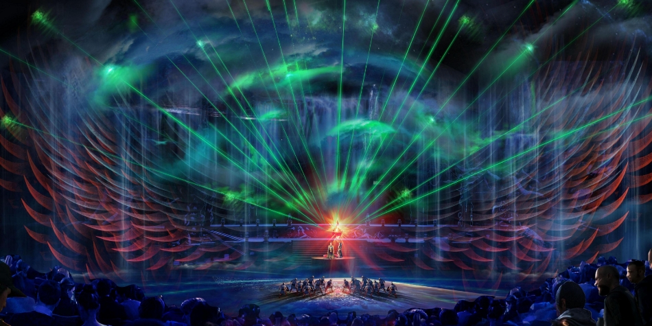 《夜版纳之傣魅》银湖大剧场位于西双版纳勐泐文化旅游区,是西南地区文化艺术的新标杆,剧场总投资3.5亿元,占地30000平方米,以自然山体及三面高达30米的景观造型为背景,构筑成约14000平方米的巨型演出舞台,其中1300平方米的升降水舞台配合3000平方米的水面浮现变化,震撼人心的1200平方米的单体LED大屏裸眼3D画面,30米高的瀑布水景汹涌而下的澎湃气势,精心设计的270度12000平方米环幕视频覆盖,营造出身临其境,波澜壮阔的观演氛围。