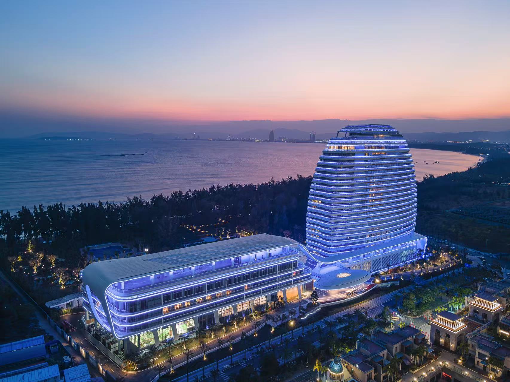 此外,酒店还配有350米超长海岸沙滩和海滨浴场、双空中无边际泳池、户外水乐园、室内恒温泳池、多功能中央大草坪、热带雨林水乐园等设施,并可定制多场景主题建筑灯光秀。