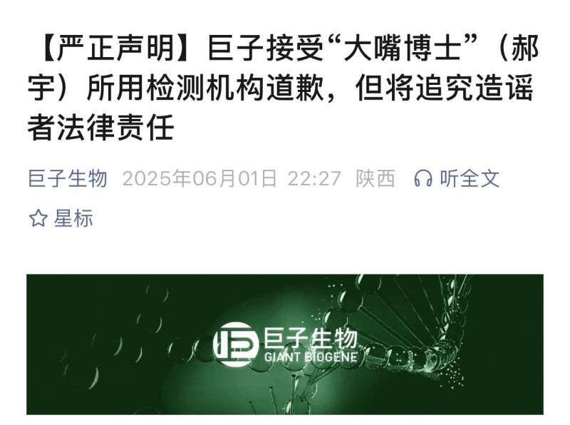 5月30日,巨子生物已收到“大嘴博士”(郝宇)所引用的检测机构正式发布的声明,其中明确表示并未授权其引用测试报告,更不认同其对外传播行为,称其行为已对社会公众造成严重误导。该机构已要求其立即停止使用该报告,以免事态进一步扩大。