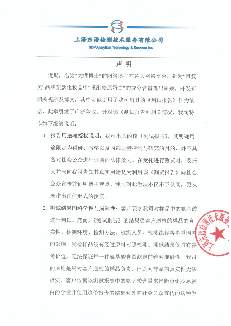 近日,“大嘴博士”(郝宇)质疑巨子生物旗下产品“可复美”不含重组胶原蛋白一事引发广泛关注。6月1日,巨子生物发布严正声明,指出“大嘴博士”所引用的检测机构已正式出具声明并否认曾做任何授权,更要求对方立即停止误导性传播。巨子生物表示,将继续坚持科学严谨的企业信念,同时对恶意抹黑者依法维权。