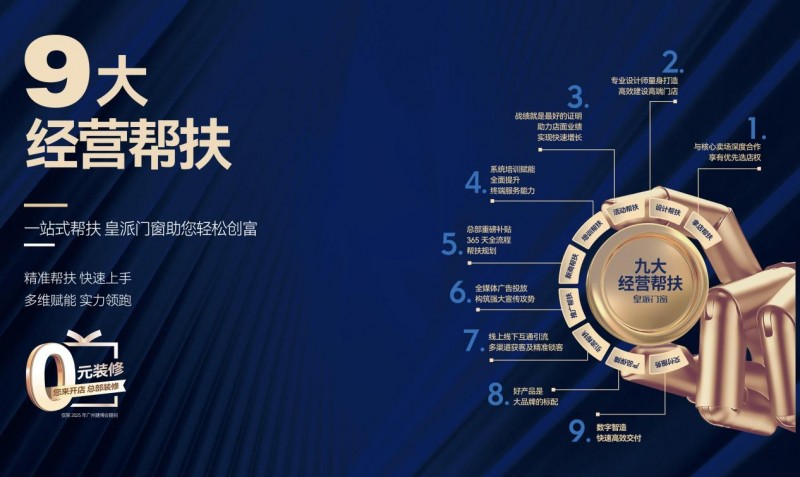 在本届广州建博会,皇派门窗除了推出重磅限时全国招商政策之外,还为合作伙伴提供从品牌力、研发力、生产力、服务力等全链路的建店帮扶政策,同时还会特邀标杆大商亲临现场,倾囊相授宝贵实战经验与经营智慧,分享真实可行的成功路径与避坑策略,打造高质量的经验交流与资源对接盛宴。