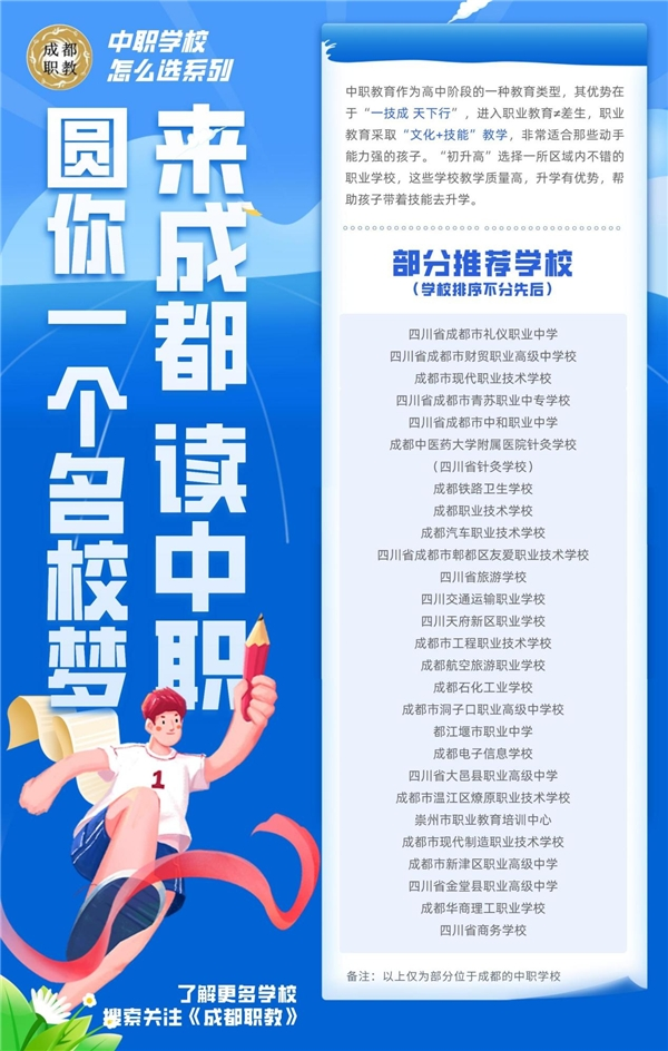 如果想到成都读中职,《成都职教》为大家搜集了部分位于成都具有招生资格的中职学校,而且具有升学优势特色,学校排序不分先后,供大家“初升高”参考。