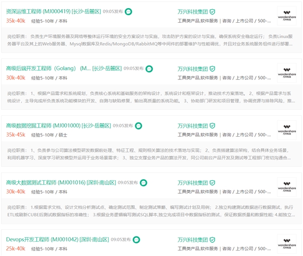 在招聘软件上可以看到,万兴科技提供的多个岗位薪资范围在30k—45K之间,而长沙市公布的2021年城镇非私营单位在岗职工年平均工资为114805元,月均约为9567元——万兴科技提供的薪资远高于此。