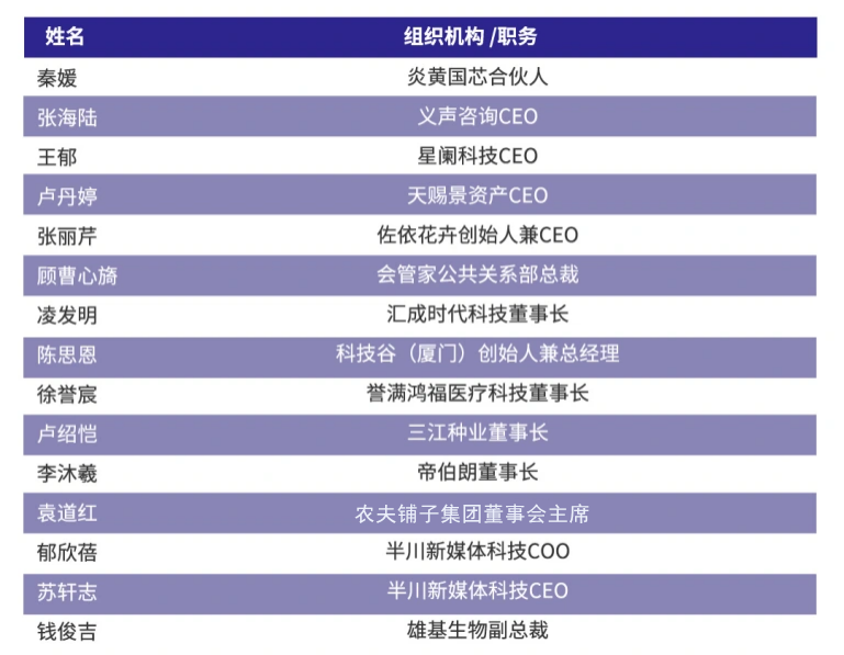 秦媛、炎黄国芯合伙人,张海陆、义声咨询CEO,王郁、星阑科技CEO,卢丹、婷天赐景资产CEO,张丽芹、佐依花卉创始人兼CEO,顾曹心旖、会管家公共关系部总裁,凌发明、汇成时代科技董事长,陈思恩、科技谷(厦门)创始人兼总经理,徐誉宸、誉满鸿医疗科技董事长,卢绍恺、三江种业董事长,李沐羲、帝伯朗董事长,袁道红、农夫铺子发展集团有限公司董事会主席,郁欣蓓、半川新媒体科技COO,苏轩志,半川新媒体科技CEO、钱俊吉,雄基生物副总裁。