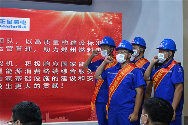 正星氢电总经理周亮对在保障冬奥项目的北京庆园街加氢站运营人员进行了颁奖及绶带披挂,以表彰他们在2022北京冬奥会“洁净冬奥”赛事中做出的贡献。正星科技总经理俞卫将印有“郑州示范城市群建设运营保障铁军”的旗帜交给了正星氢电运营团队,运营团队进行了庄严的誓师宣誓。