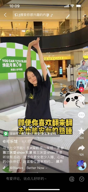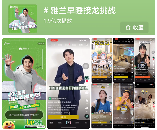 这几年,无论是主打“深睡概念”还是“健康定制”,好像都不太能挠到用户情绪了。头脑冷静下来的企业已经不再关注概念,而是开始琢磨用户情绪。比如从洞察这个时代的睡眠问题,特别是年轻人的睡眠情绪开辟新流量阵地。最近素有国民品牌老字号之称的香港雅兰床垫,在抖音发起“早睡接龙挑战”,号召广大国民培养健康早睡意识,并出资奖励参与早睡挑战的网友,引发1.9亿次话题点击,形成现象级传播,就是最好的例证。