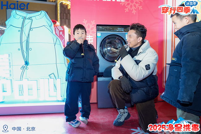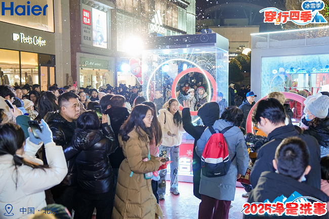在跨年活动现场、京城用户体验到的2024年的最后一场雪、2025年的第一场雪是有海尔X11洗衣机风巡航科技带来的、海尔风巡航科技为新年落下爱的初雪、坚守一份真爱、化作一地雪白,见证浪漫与科技同在!