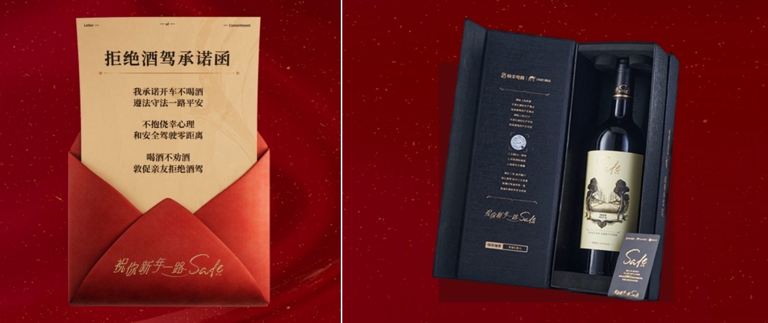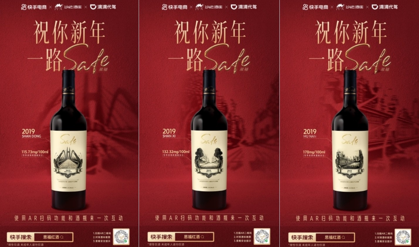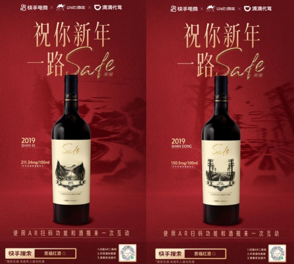 以此为出发点,快手电商联合沙地红酒与滴滴代驾,在春节前推出一款特别设计的红酒——思福红酒,取自“酒后三思 福亦随行”的寓意,英文为Safe,寄予安全的美好寓意,这是来自一支红酒的平安祝福。