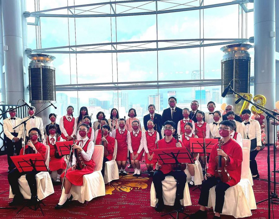 二零二二年十月一日国庆日,文善社旗下的湾区爱乐香港乐团少年团为中华人民共和国成立七十三周年庆祝活动演奏,乐团获邀出席香港特区政府举办的升旗仪式暨酒会。在文善社主席何荣添博士BBS, MH、会长张启明先生及创会会长杨宇思博士 MH的领导下,由吴家明指挥及龙向辉团长带领的湾区爱乐香港乐团少年团为出席本届酒会的贵宾演奏了多首经典曲目, 包括古筝齐奏:《云之南》、《伊犁河畔》;少年团与警察合唱团演奏: 《我和我的祖国》、《狮子山下》、《东方之珠》、《You Raise Me Up》、《我的祖国》等。会场上,乐手演奏曲声悠扬动人,为国庆酒会增添喜庆氛围。民政及青年事务局局长麦娟女士 SBS, JP 在演奏后逐一与少年乐手谈话,送上鼓励并与众乐手和指挥等人大合照。酒会上,宾客们纷纷拍照留住这庆典欢欣瞬间。行政长官李家超先生 大紫荆勋贤, SBS, PDSM, PMSM、全国政协委员霍启刚先生 JP 及民政事务局更将湾区爱乐香港乐团少年团的演出相片发放到社交媒体上,可见青年发展和培育与特区政府以至国家长远的发展紧密相连,体现了国家主席习近平在今年七一回归庆典中提及的「青年兴,则香港兴﹔青年发展,则香港发展﹔青年有未来,则香港有未来」。