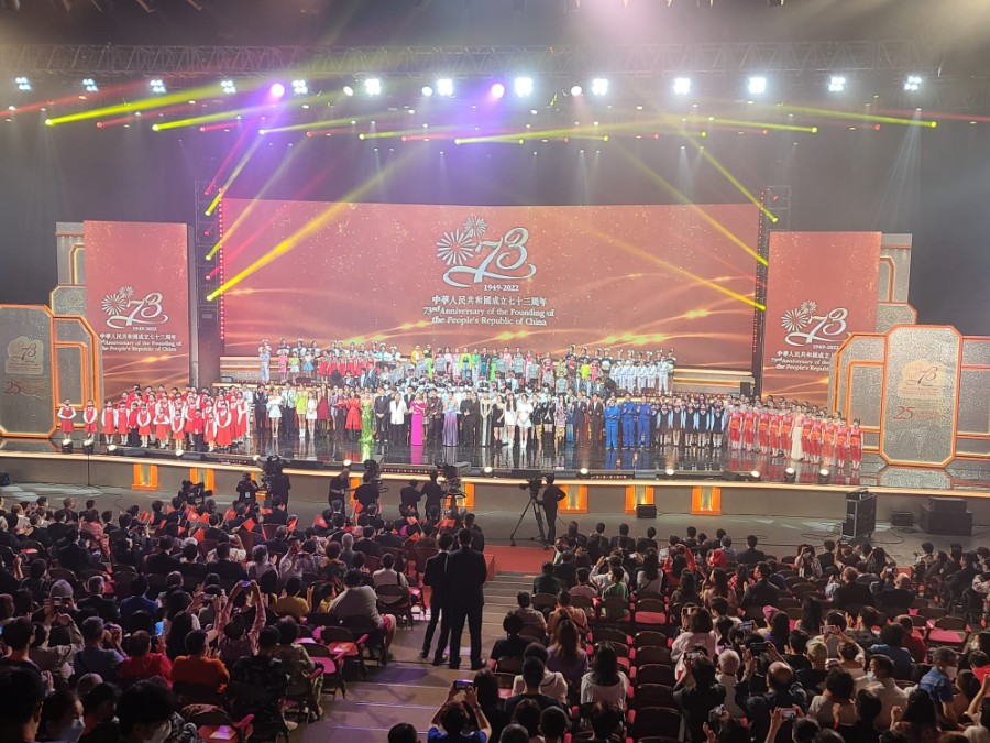 晚会尾声时,所有演出嘉宾和团体合唱《歌唱祖国》作为结尾,曲声歌声昂扬共融,汇聚成气势磅礴的大合唱,画面动容。在观众席的贵宾包括行政长官李家超、前行政长官曾荫权、林郑月娥,全国人大常委谭耀宗等人跟随曲声挥动手上的国旗,嘹亮的歌声回荡在红馆,用音乐表达香港同胞对国庆七十三周年的喜悦情感。