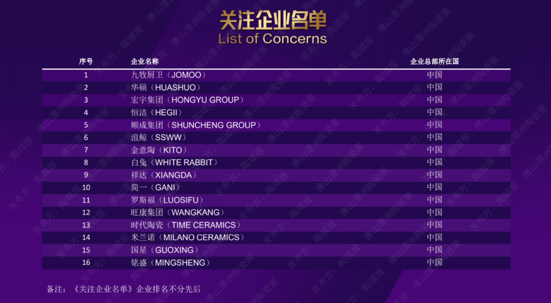 本次世界陶瓷卫浴100强排行的统计对象包括全球陶瓷、卫浴企业,排名主要以企业营收规模作为依据,同时综合多维度考察。入选100强榜单的企业 最小营收规模为10亿元人民币。另据介绍,陶瓷卫浴行业存在“隐形冠军”,考虑到部分企业缺乏严谨规范的数据统计支撑,秉着严肃客观的原则,本次统计将该类企业列为《关注企业名单》。