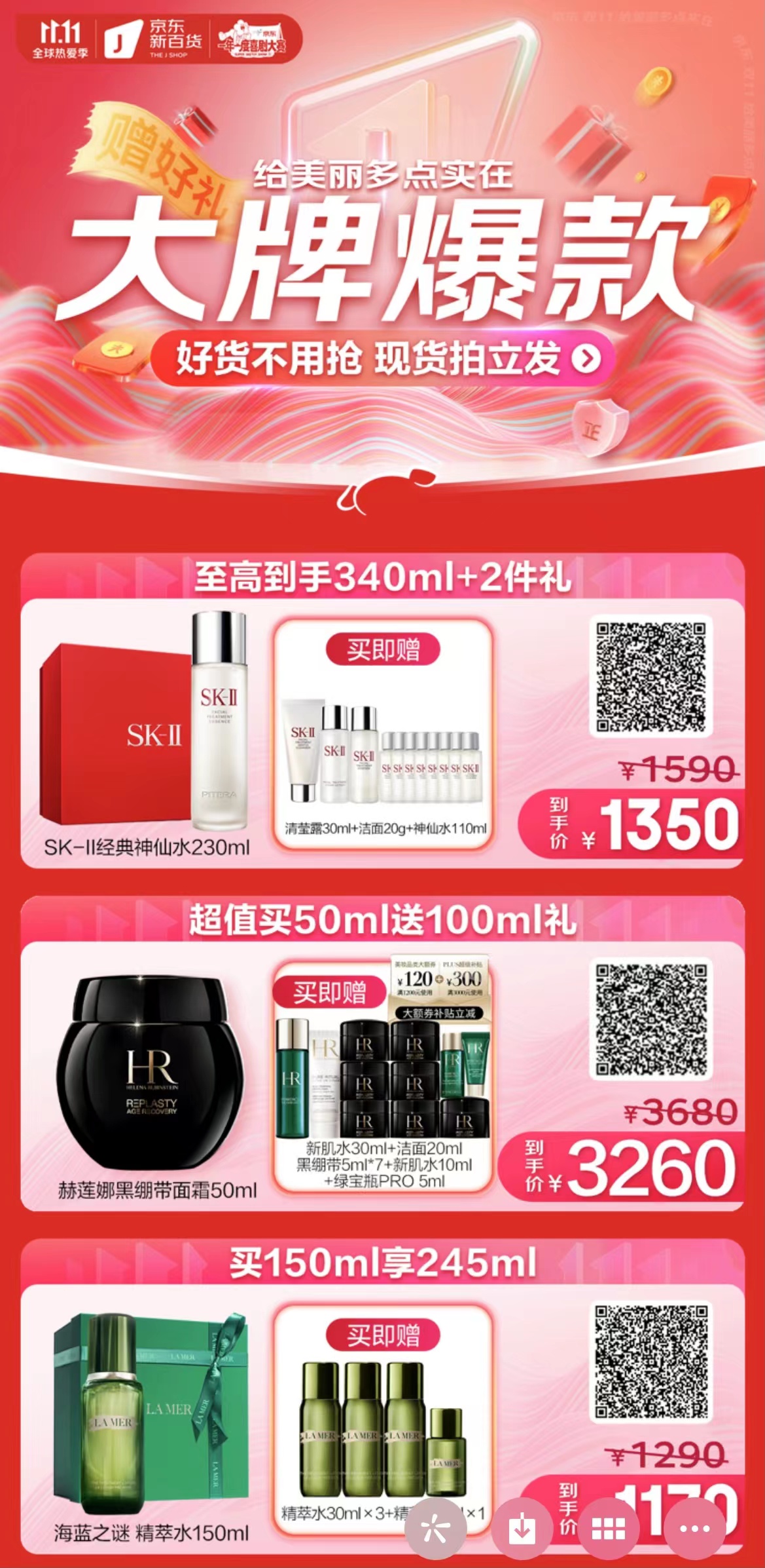 今年以来,京东新百货迎来ARMANI阿玛尼美妆、LA MER海蓝之谜、BOBBI BROWN芭比波朗、LA PRAIRIE莱珀妮等十余个国际美妆大牌相继入驻,让这个11.11的美妆大牌、品类、商品数量均超越以往,为大牌爱好者带来了更加丰富、奢宠的置妆新选择。巅峰28小时期间,大牌美妆爆款现货已备齐,物流极速到家。其中,风靡全球的SK-II神仙水买230ml至高到手340ml+2件礼,恒久御龄的赫莲娜黑绷带面霜买50ml送100ml礼,实力淡纹的雅诗兰黛小棕瓶眼霜买30ml赠40ml,修护抗老的海蓝之谜精华面霜买60ml享105ml。此外,还有后天气丹礼盒、娇韵诗焕颜四部曲、欧莱雅玻色因水乳礼盒等大牌护肤礼盒享受超值买赠福利,为消费者打造全流程的实效护肤体验。