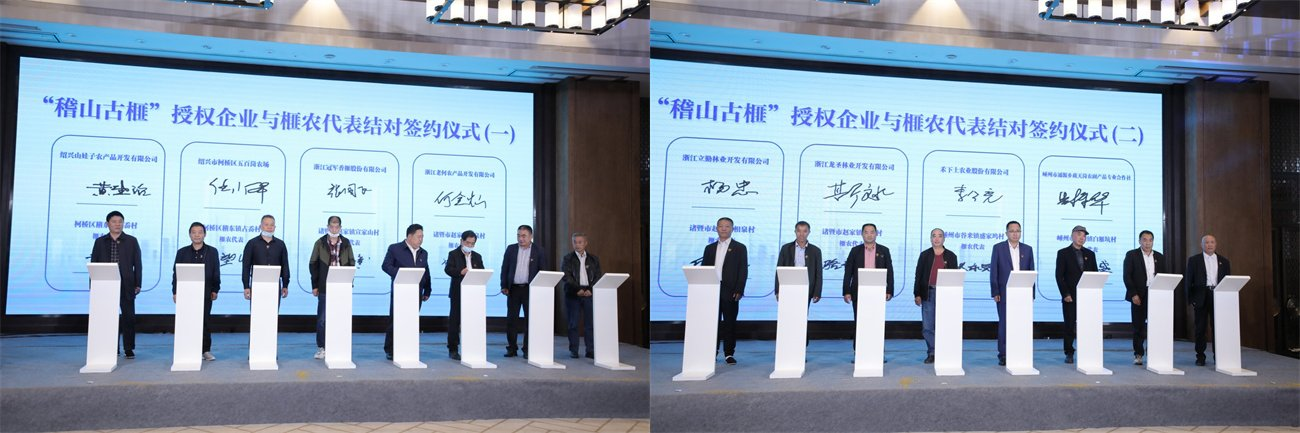 推进会上还进行了助力山区共富古香榧树流转签约仪式,旨在鼓励引导香榧龙头企业、合作社等社会力量投身古香榧保护和利用,通过流转古香榧树,实行规模化经营,推动榧农增收共富,共同实现香榧行业可持续发展的新格局。“稽山古榧”品牌经过两年的建设推广,带动榧农致富的成效初步显现,旗下“隋榧”产品价格超过了5000元/斤,为香榧产品设置了价格标杆,且一经面世就销售一空,带动了全市香榧价格进一步提高;“稽山古榧”品牌建设也让绍兴香榧知名度进一步提升,据了解,近两年绍兴香榧在江浙沪地区的知晓率提升了将近50%,会稽山古香榧的价值也被越来越多的人所认可。