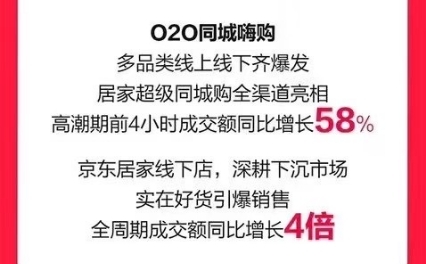 京东11.11期间,京东新百货全渠道业务同步发力,联合多家品牌推出“同城嗨购 门店速达”活动。线上线下全渠道共振,为消费者带来线上线下融合、沉浸式家电家装一站购创新购物体验,促使居家线下店11.11全周期成交额同比增长4倍。