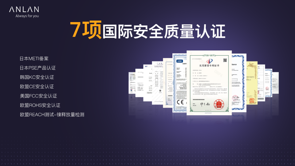 在产品研发上,ANLAN始终铭记“陪伴用户成长”的初心,产品从研发、测试到生产、销售,都坚持“自研、自创、自选、自生产”,每道工程,都带着匠心精神去完成。ANLAN产品也因此获得了60+项国际质量权威检测认证,以及150+项国际产品专利。