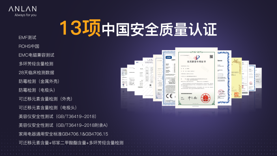 据介绍,安兰ANLAN早在2021年,便已提前对家用美容仪的质量把控体系进行了布局,携手中国家电协会、中国消费品质量安全促进会等权威机构,联合多方专家制定了《家用光子美容仪团体标准》(标准编号: T/CHEAA.0020-2021 )、《中国毛孔清洁仪团队标准》等。