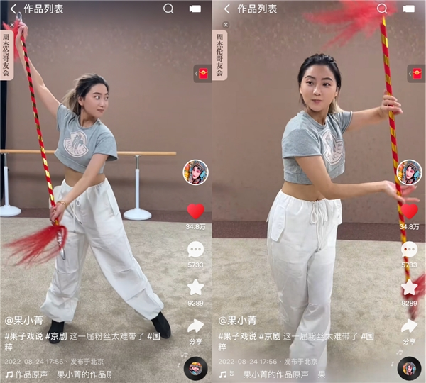只有降低门槛,观众才能更容易了解这项艺术。“先吸引关注,再传播文化。”果小菁开始从京剧文化的小点出发,与当下流行元素相结合,以小见大,浅入深出。变装视频、“京剧彩妆”步骤、造型过程……“每当有数据较好的作品,我们就当做成功模版保留,再拓展下一个。”她有一个短视频工作室,摄影、剪辑、助理……无一例外在之前没接触过京剧,但他们却成了果小菁作品的场外指导。有一次,她计划拍一段耍花枪的视频,工作室小伙伴想看“花枪从手中扔出再接住”的招式,果小菁就根据建议进行编排。在这些“非专业人士”帮助下,视频果然收获了不错的效果。