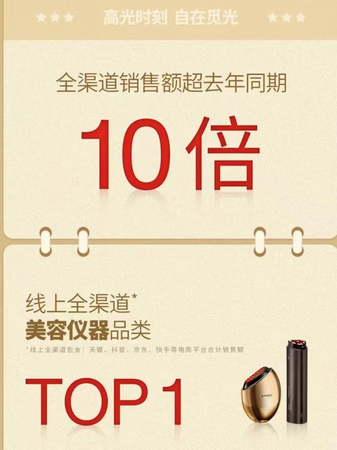 从官方披露的双11战报来看,AMIRO觅光取得多项佳绩:全渠道销售额超去年同期10倍,拿下全渠道美容仪品类TOP1,其高清化妆镜连续5年蝉联品类第一,红光波脱毛仪全平台销售同比增长超50%。从各平台数据来看,AMIRO觅光增长势头强劲,在天猫平台,六极射频美容仪同比去年双11全期增长超300%,33分钟实现销售额破亿,超去年双11全期;抖音销售额超去年同期150倍,京东销售额同比增长770%。