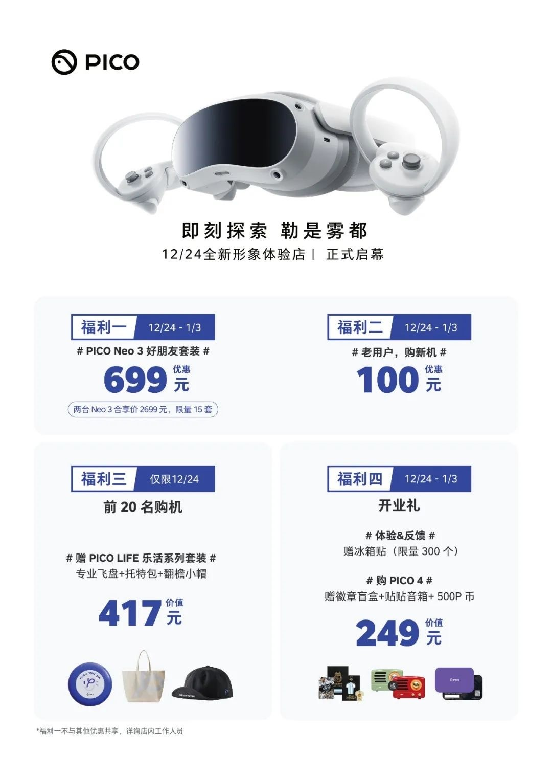 除此之外,PICO 推出重磅优惠回馈新老用户。活动当天购机前20名的用户,可获赠价值417元的 PICO LIFE 乐活系列套装。同时,在12月24日-1月3日期间到店体验和购买 PICO 4 的用户都有机会获得精美礼品,更有好友购机和老用户购新机多重优惠等着大家。