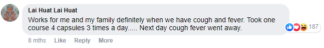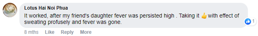 网民“Lotus Hai Noi Phua”的用户表示:“当我朋友的女儿持续高烧使用它后,很管用。服下后,随着大汗淋漓的效果,发热消失了。”