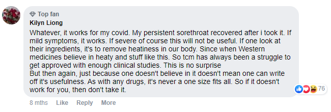 网友“Kilyn Liong”表示:“不管怎样,它对我的新冠很管用。我的顽固性喉咙痛在服用后治好了。对轻症它很管用,对重症可能作用有限。看连花清瘟的成分,它是帮助我们身体泄热的。西医什么时候相信内热和堵塞了。所以中医药一直很难通过足够的临床证据而获得批准,这并不奇怪。但是我要强调的是,不能仅仅因为某些人不相信它,而磨灭它的疗效。当然,所有药都不是万能的。如果它对你没用,就不要服用它。”