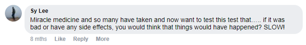 “Sy Lee”表示:“神奇的药物,很多人都已经使用过,现在却要检验这检验那的............如果它没用或者有副作用,那现在会是什么样?马后炮!”