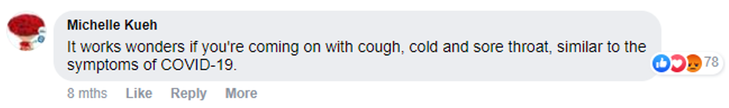 “Michelle Kueh”留言到:“当你出现咳嗽、感冒和喉咙痛,类似新冠肺炎的症状,它会给你惊喜。”