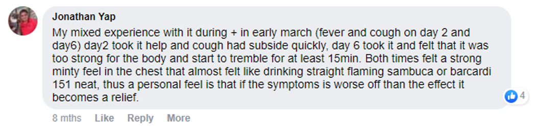 用户“Jonathan Yap”:“我在三月初阳性时对它的混合体验:感染第2天服用很管用,咳嗽很快缓解;第6天服用后感觉药效太强了,身体哆嗦了15分钟。两次都感觉到了胸腔内强烈的清凉感,感觉像喝了口燃烧的萨姆布卡酒或纯的Barcardi151(笔者注:一种朗姆酒)。因此个人感觉如果症状很难受,能压得住药效,它就会帮助缓解症状。”