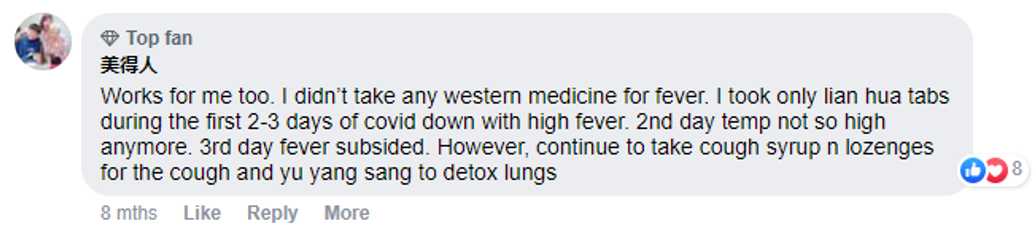 网名“Lai Huat Lai Huat”的用户表示,“当我和我的家人咳嗽和发烧时,连花清瘟绝对有效。每次服用4粒,一日三次,第二天咳嗽和发烧都消失了。”