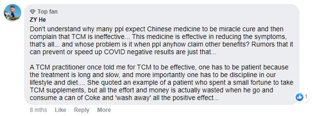 网友“ZY He”留言表示:“不明白为什么很多人期待中医药是灵丹妙药,然后又抱怨中医药无效。这个药能有效地缓解症状,就是如此。当人们无论如何要宣称它的其它好处,这是谁的问题?比如它能‘预防’新冠......一位中医师曾告诉我,中医药要有效,必须要有耐心,因为治疗过程需要时间,并且更重要的是病人在生活方式和饮食中也要多加注意。”