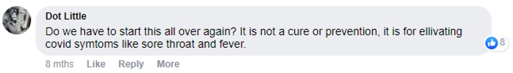 网友“Dot Little”说:“我们又要开始争论这个话题了吗?它不是一个解药或预防,它可以减轻喉咙痛和发热等新冠肺炎症状。”