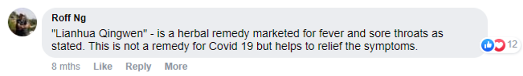 “Roff Ng”表示:“连花清瘟是一种针对发热、喉咙痛等症状的植物疗法。它不是新冠的解药,但能够帮助缓解症状。”