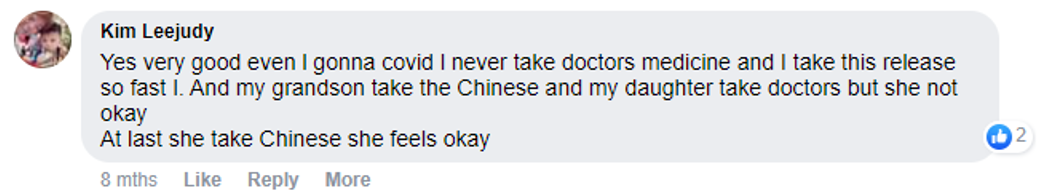 网友“Kim Leejudy”:“是的,非常好。我确诊后没吃医生给的药(笔者注:该行为不推荐),就服用了这个,见效很快。我的外孙也使用了这款中药,而我的女儿用了医生给的药,她康复得很慢,最终她还是用了这个中药才好。”