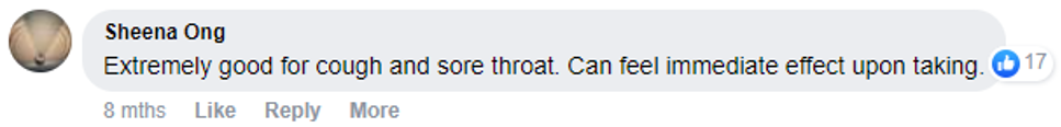 “Sheena Ong”说:“对咳嗽和喉咙痛非常非常管用。服用后能够立刻感受到效果。”