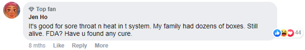网友“Jen Ho”:“它对喉咙痛和身体退热很有用。我家里备有几十盒。活得好好的。FDA你们找到什么别的好治疗方法了吗?”