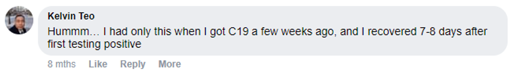 用户“Kelvin Teo”:“嗯......几周前我感染新冠时只有这个药可用。在第一次检测呈阳性后7、8天我恢复了。”