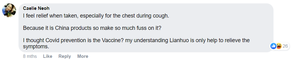 网友“Caelie Neoh”表示:“服用后我感到胸腔内如释重负,特别是咳嗽的时候。就因为它是中国产品,所以大家这么大惊小怪吗?我理解的新冠预防应该是疫苗?连花是用来帮助缓解症状的。”