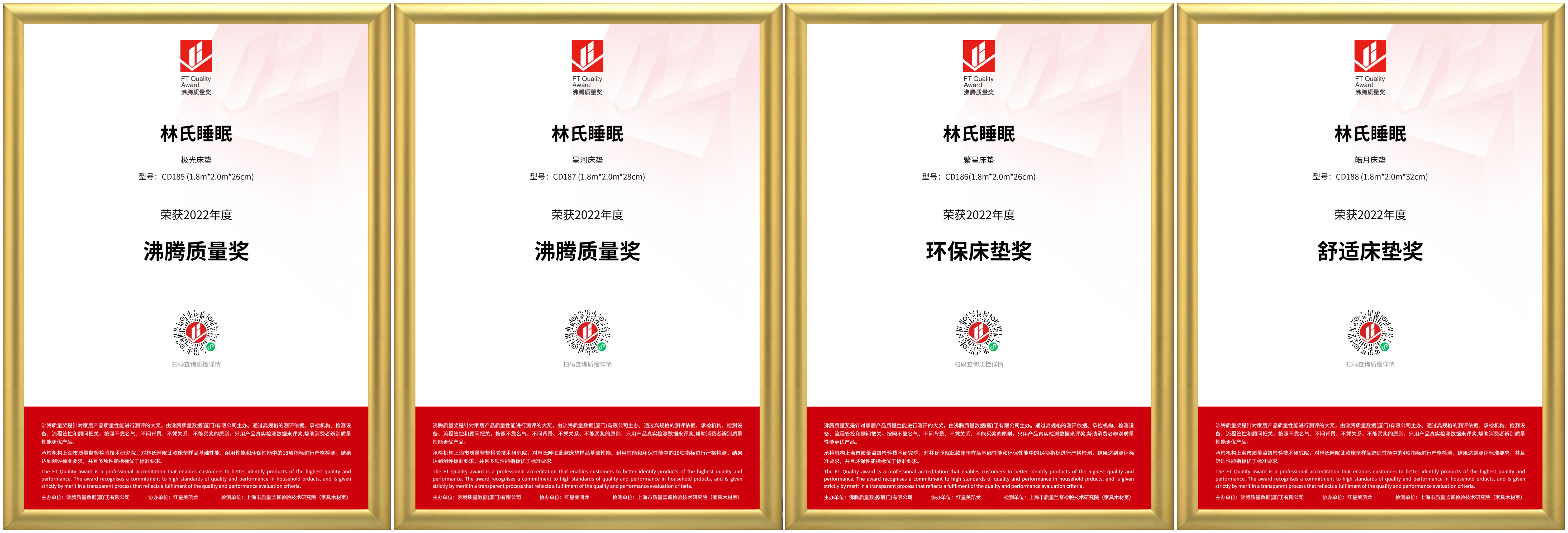 据悉,12月获奖榜单由沸腾质量奖指定上海市质量监督检验技术研究院检测评选,分别针对基础性能、耐用性能、环保性能、舒适性能的维度进行严格的评定。本次榜单中共有7款床垫获奖,其中林氏睡眠就“霸榜”4款,分别拿下“舒适”、“环保”、“质量”三大奖项,获得行业权威认可的背后,是林氏睡眠自品牌创立以来在产品品质上的高度投入。