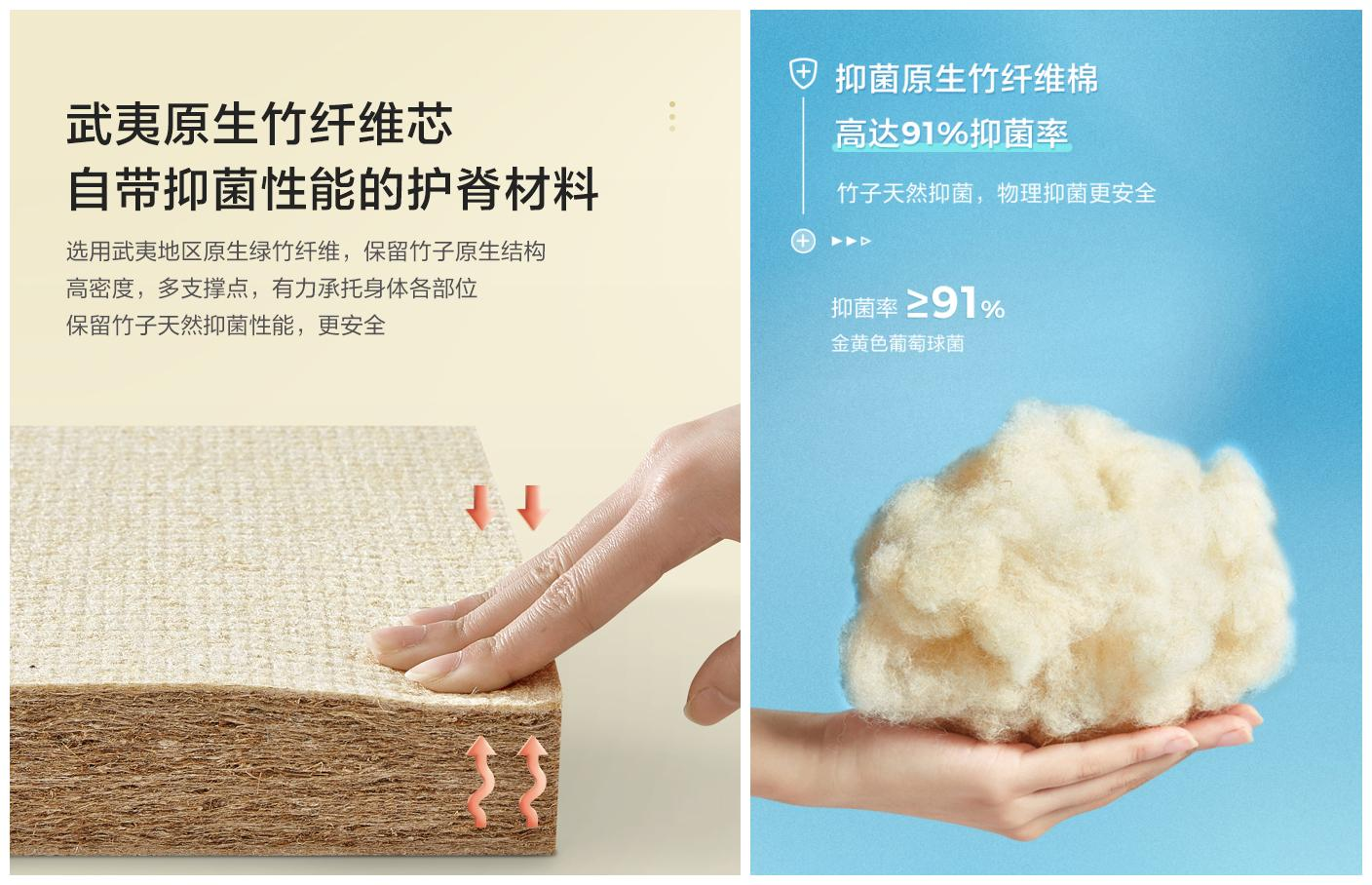 在此之前,传统床垫大多采用橡胶、棕榈、丝绵等作为支撑层材料,而原生竹纤维不仅拥有以上材质的优势,同时因其结构的特殊性,拥有比其他材质更优的吸湿性、透气性,同时表现出了持久的抗菌性和抑菌性,可以极大提升床垫的使用感受。