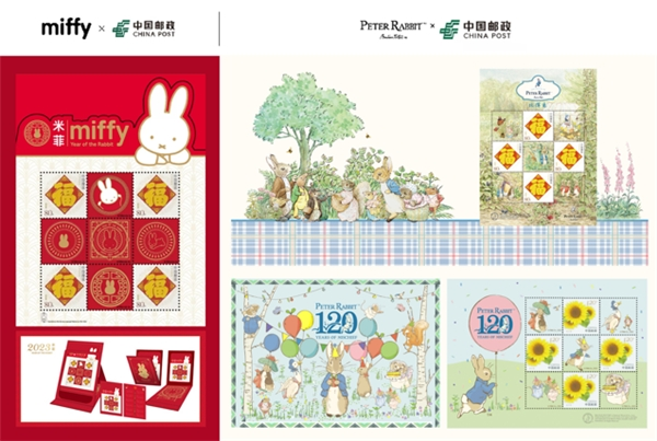 每年中国邮政的生肖邮票都是“热搜预定”,米菲和比得兔分别联合中国邮政,推出生肖邮票套组、邮折、贺卡、信封、信纸、贴纸等一些列文创产品,用传统的方式,邮递出温馨愉快的兔年祝福。
