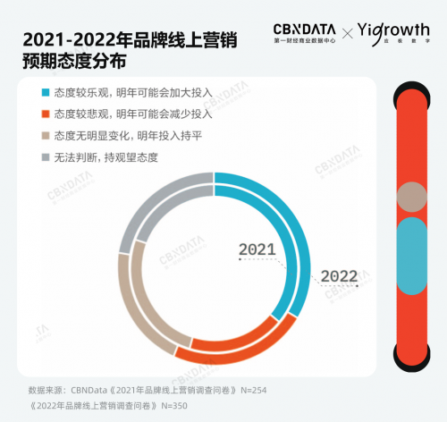 CBNData问卷显示,在参与调研的品牌中,2022年选择减少线上营销投入的品牌同比增加25%。从具体金额投入来看,投入在100-500万之间的比例明显上升,而500万以上的区间均呈现下降趋势。同时,相比2022年,品牌对2023年整体营销投入持悲观态度的比例上升超过5%,而持观望态度的占比同样有所上升。