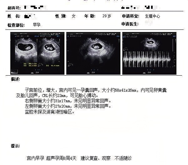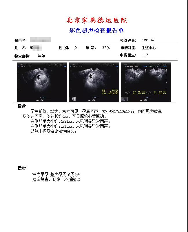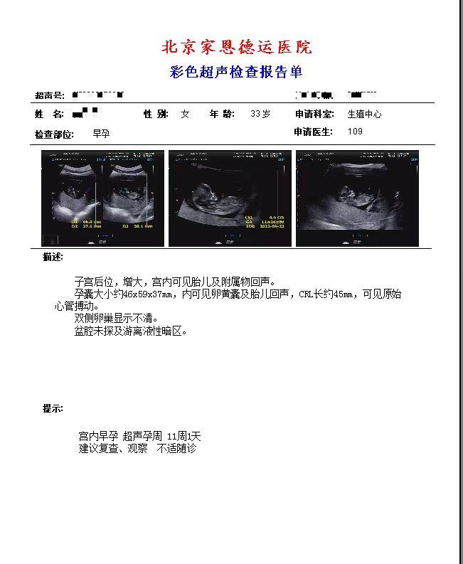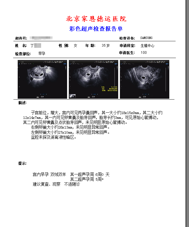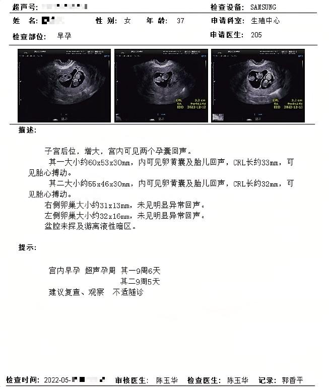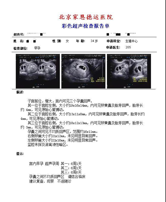 四、朱女士,34岁,外院试管婴儿治疗反复失败,参加联合门诊后建档进周,取卵一次移植两次后成功怀孕。B超显示三孕囊,后根据身体状况进行了减胎手术。